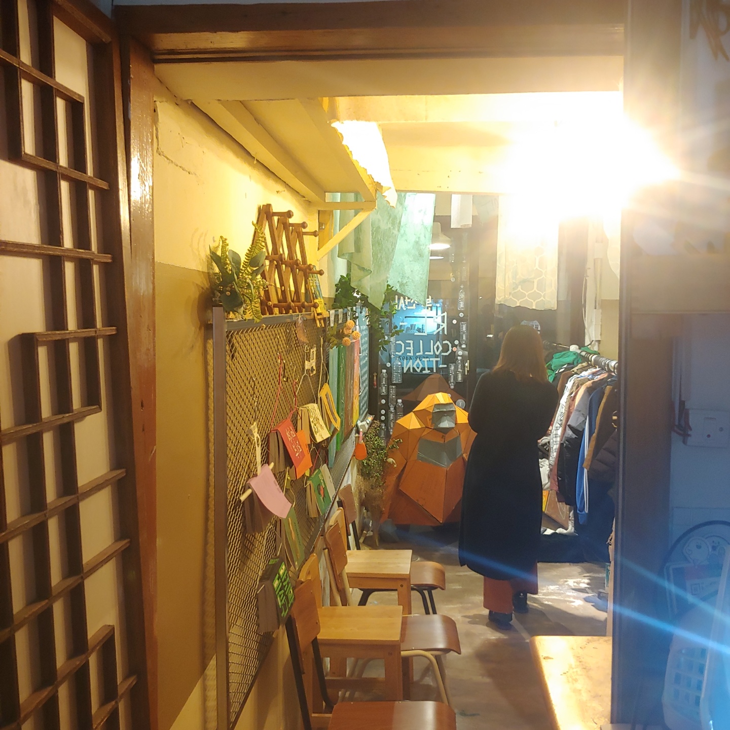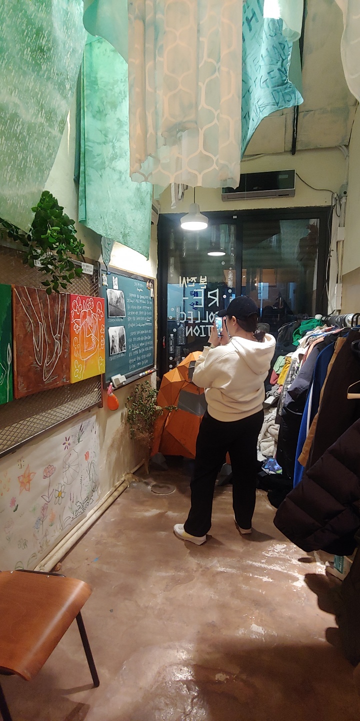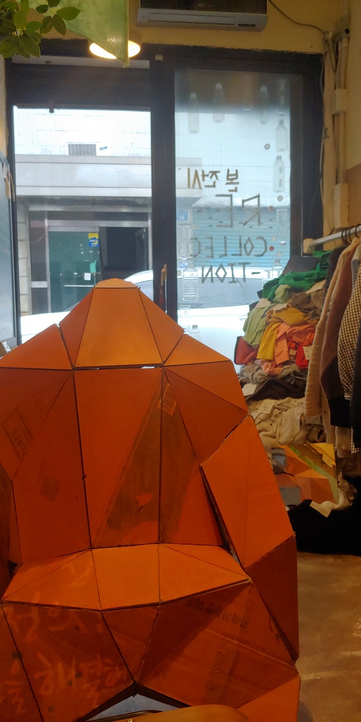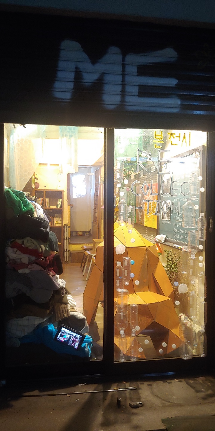 1차적으로 저에게 ‘재-수집’되었던 헌 옷들로 오브제와 설치를 진행하였습니다. 창윤 작가님의 오랑우탄이 잃어가고 있는 서식지(자연)을 의미하기도 하며, 옷들과 천에는 우리가 잃어가고 있는 것들에 대한 문구를 새겨보았습니다.