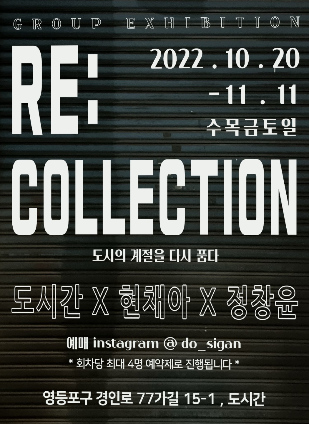 📎 이번 전시는 환경문제 대부분을 지니고 있는 ‘패스트 패션’을 중심으로 8월부터 기부받은 헌 옷을 활용해 문제에 집중하도록 소수 인원으로 제한하며, 도시간에서의 보고, 읽고, 소통하며, 느껴보는 경험의 일부가 물건들로 꽉 채워진 당신의 삶에 조금이나마 가벼워지길 바라는 마음으로 기획했다. 근본적으로는 우리가 시작한 문제를 우리가 풀어보는 자리이다.